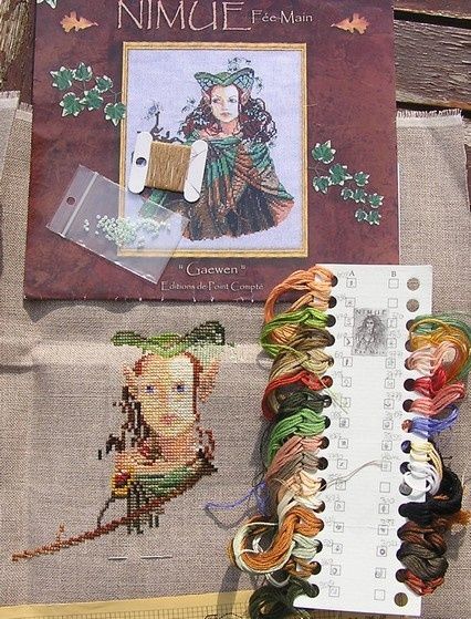 Il s'agit d'un modèle de Nimuë, Gaewen. J'avais pris un plaisir fou à broder "La pipe" et je me suis laissée tenter par cette elfe élégante. Mais c'est très marron. Et j'ai commencé à me perdre une fois arrivée dans ses cheveux. Et ce n'est rien à côté de son habit: très grand et très marron. J'ai essayé de me motiver en me disant qu'une fois les cheveux finis, je pourrai faire le petit papillon joli mais cela n'a pas suffit. Peut-être pas assez de papillons. Pourtant, je l'aime beaucoup; il est donc temps de cesser ces enfantillages. Allez hop! Défi 2013: je me charge de finir cet ouvrage. Voilà, c'est écrit! Y a plus qu'à! Et avec un seul papillon...mais aussi avec des perles (chouette) et un fil qui brille (re-chouette).