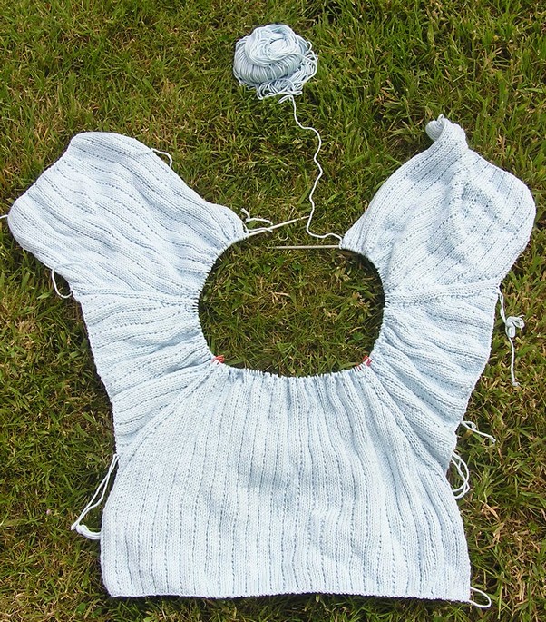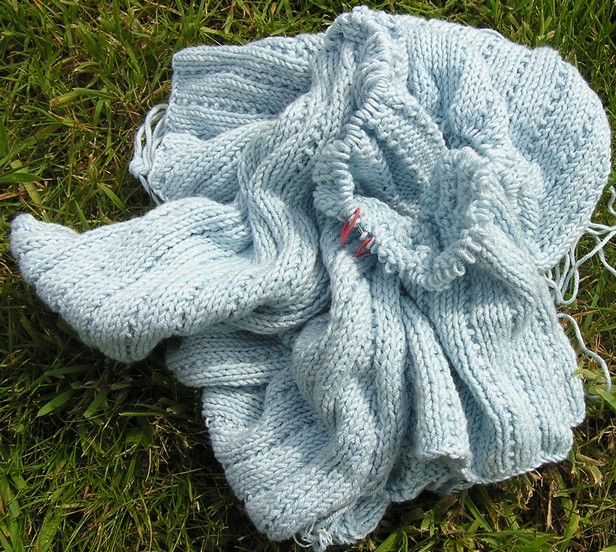 Et le mien a une bonne tête de boulet. J'ai démarré avec enthousiasme jusqu'à ce que j'arrive au moment où tous les morceaux (dos, devants et manches) se retrouvent ensemble sur les aiguilles circulaires pour continuer à monter, monter, monter... Tout ce bleu en côtes, je n'en pouvais plus. J'ai arrêté puis repris, puis rarrêté puis rerepris... A ce jeu-là, ça devenait aussi très pénible de se remettre dedans à chaque fois.